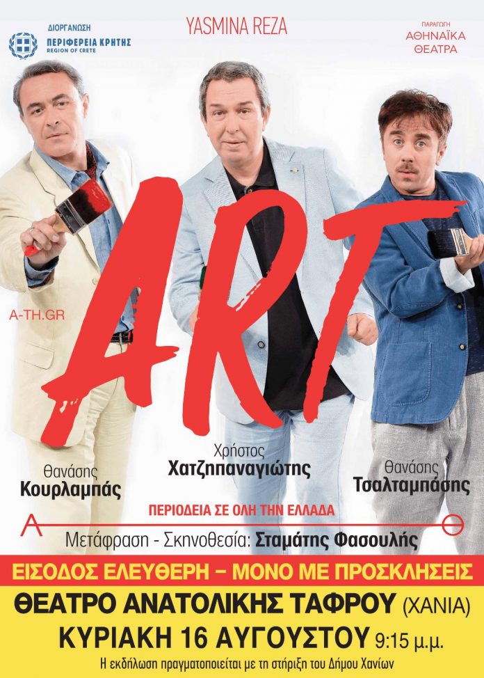 Η Περιφέρεια Κρήτης διοργανώνει με τα Αθηναϊκά Θέατρα την θεατρική κωμωδία ‘ART’ της Γιασμίνα Ρεζά σε Ηράκλειο, Χανιά και Ρέθυμνο σε μετάφραση και σκηνοθεσία του Σταμάτη Φασουλή.