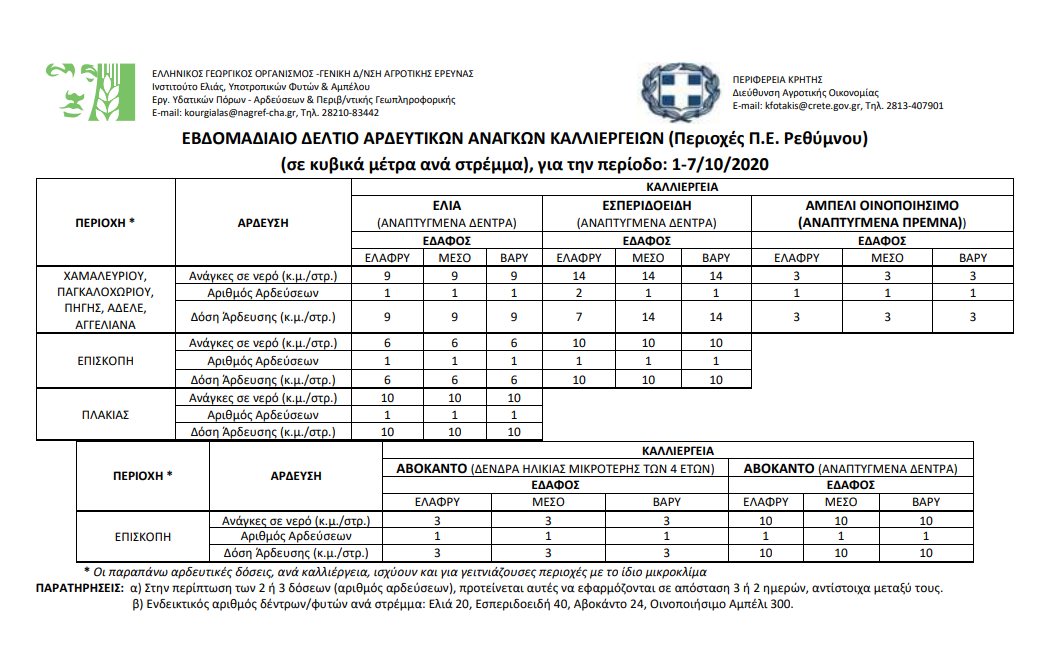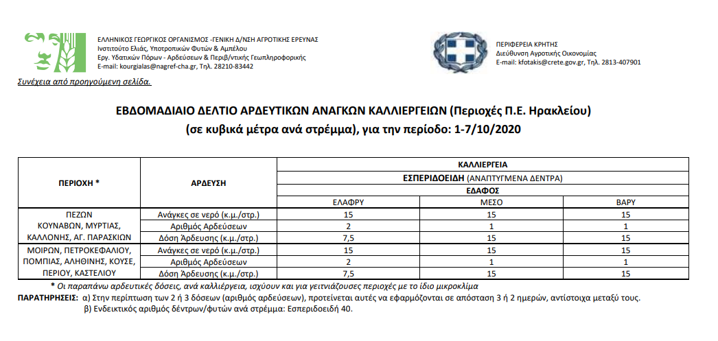 Εβδομαδιαίο δελτίο αρδευτικών αναγκών καλλιεργειών Περιφερειακής Ενότητας Ηρακλείου