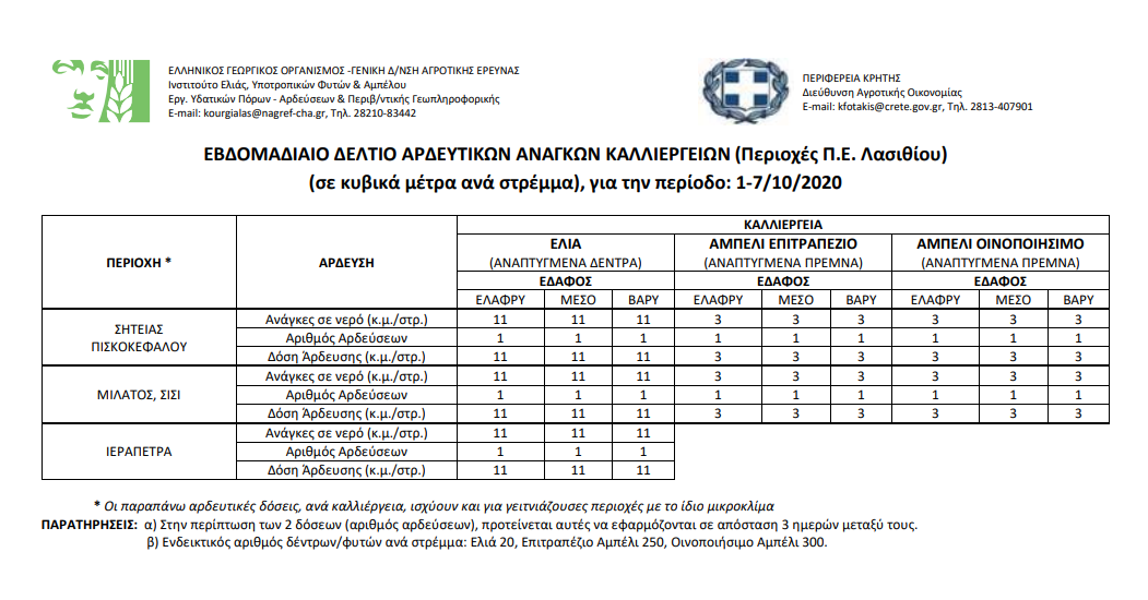 Εβδομαδιαίο δελτίο αρδευτικών αναγκών καλλιεργειών Περιφερειακής Ενότητας Λασιθίου