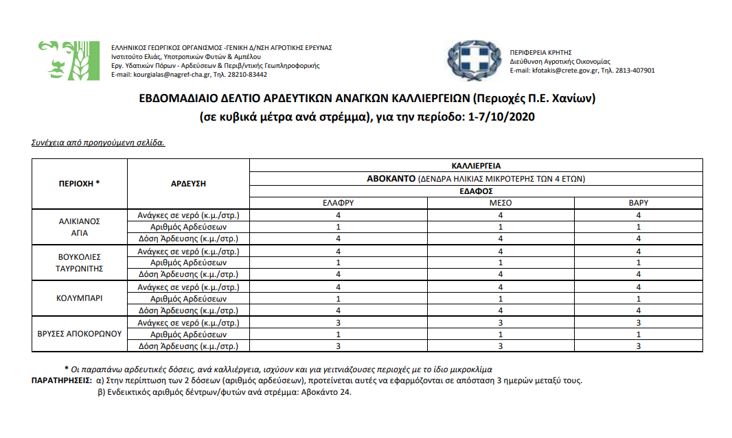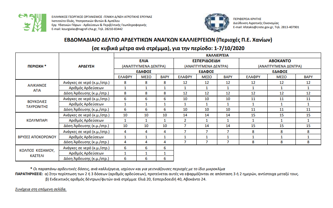 Εβδομαδιαίο δελτίο αρδευτικών αναγκών καλλιεργειών Περιφερειακής Ενότητας Χανίων