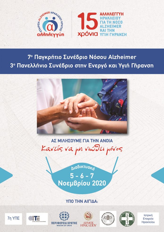 Από σήμερα 5, 6 και 7 Νοεμβρίου 2020 θα πραγματοποιηθεί διαδικτυακά το 7ο Παγκρήτιο Διεπιστημονικό Συνέδριο στη Νόσο Alzheimer και το 3ο Πανελλήνιο στην Ενεργό και Υγιή Γήρανση, από την Εταιρεία ALZHEIMER Ηρακλείου Κρήτης «Αλληλεγγύη», με την αιγίδα της Περιφέρειας Κρήτης.