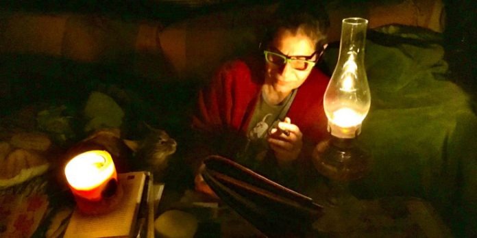 Συνοδεύοντας την ανάρτησή της με δύο εξίσου δραματικές φωτό, στις οποίες φαίνεται να διαβάζει υπό το φως μιας λάμπας, καθώς, όπως γράφει η κόρη του Μίκη Θεοδωράκη στην ανάρτησή της, της έκοψαν το ρεύμα.