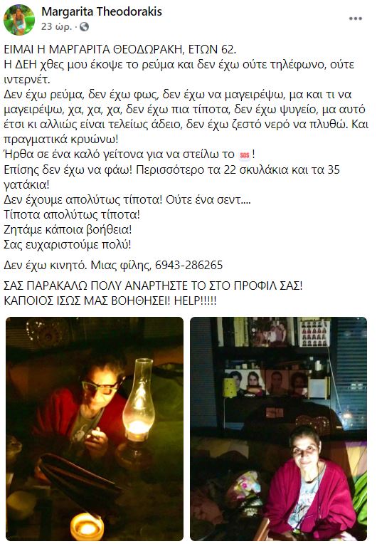 «Δεν έχω ρεύμα, δεν έχω φως, δεν έχω να μαγειρέψω, μα και τι να μαγειρέψω, χα, χα, χα, δεν έχω πια τίποτα», έγραψε η Μαργαρίτα Θεοδωράκη, κόρη του μεγάλου μουσικοσυνθέτη Μίκη Θεοδωράκη, στον λογαριασμό της στο Facebook.