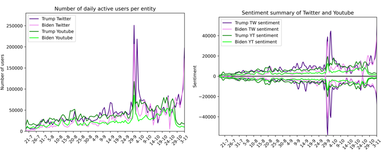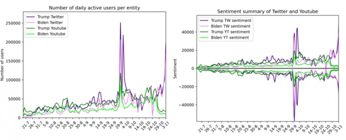 Τα αποτελέσματα της ανάλυσης συναισθημάτων στην συλλογή του Twitter αλλά και στα σχόλια του YouTube που συγκεντρώθηκαν, δείχνουν την κατανομή των θετικών και αρνητικών συναισθημάτων για τους δυο υποψήφιους, καθ’ όλη τη διάρκεια αυτής της περιόδου. Πιο συγκεκριμένα, στο Twitter, το 35,2 % εκφράζει θετικό συναίσθημα απέναντι στον Trump και το 28% θετικό συναίσθημα προς τον Biden, ενώ το 18% των χρηστών εκφράζει θετικά συναισθήματα στα μεταδεδομένα του YouTube για τον Trump και το 12% για τον Biden.