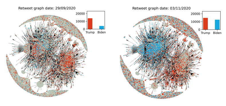 Το γράφημα των retweet (Ιούλιος – Σεπτέμβριος 2020) που βασίζεται στην ημερήσια επισκεψιμότητα ανά διαδεδομένο hashtag, δείχνει τη σταδιακή εξέλιξη και την αύξηση της κινητικότητας στην περίοδο πιο κοντά στις εκλογές, για τους δύο υποψηφίους, Biden και Trump.