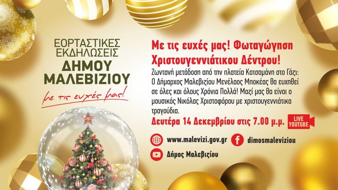 Με έναν διαφορετικό τρόπο λόγω της πανδημίας του κορωνοϊού και με πρώτο μέλημα τη διασφάλιση της δημόσιας υγείας, θα πραγματοποιηθεί σήμερα το απόγευμα στις 7:00μ.μ. η φωταγώγηση του Χριστουγεννιάτικου Δέντρου στο Γάζι. Τηρώντας όλα τα υγειονομικά μέτρα προστασίας, στη φετινή φωταγώγηση δε θα συμμετέχουν οι δημότες, αλλά θα την παρακολουθήσουν μέσω διαδικτύου, καθώς θα μεταδοθεί ζωντανά στο κανάλι του Δήμου Μαλεβιζίου στο YouTube.
