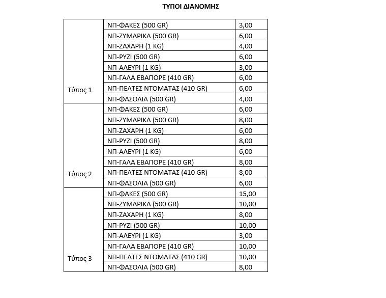 Η διανομή που θα πραγματοποιηθεί θα διανέμει προϊόντα παντοπωλείου (αλεύρι, ρύζι, ζάχαρη, γάλα,πελτές ντομάτας, φακές, ζυμαρικά, φασόλια)