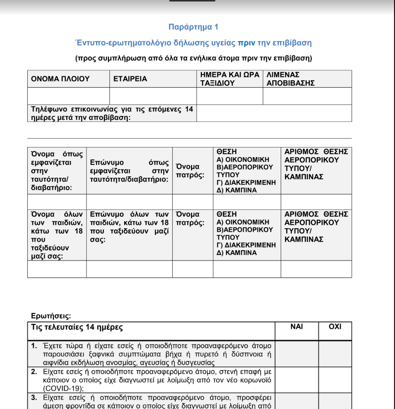 Τη δήλωση θα μπορεί κάποιος να τη συμπληρώσει ηλεκτρονικά και να την εκτυπώσει προκειμένου να την έχει μαζί του πριν από την επιβίβαση, στη σχετική διεύθυνση του αρμόδιου υπουργείου (εδώ).