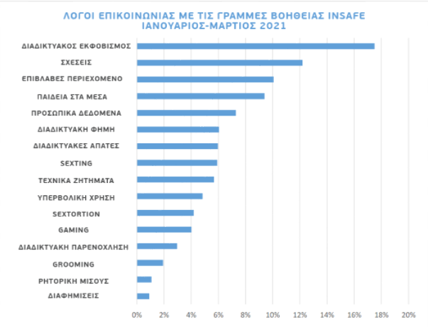 Ο διαδικτυακός εκφοβισμός συνεχίζει να είναι ο νούμερο ένα λόγος επικοινωνίας με μια γραμμή βοήθειας στην Ευρώπη και ακολουθούν θέματα σχέσεων και επιβλαβούς περιεχομένου. Ενδιαφέρον παρουσιάζει το γεγονός ότι αυξήθηκαν οι κλήσεις που αφορούσαν θέματα ψυχικής υγείας που προέκυψαν από την παρατεταμένη περίοδο του lockdown και θέματα υπερβολικής χρήσης του διαδικτύου ως αντίκτυπο της πανδημίας και της απομόνωσης που αυτή επέφερε.