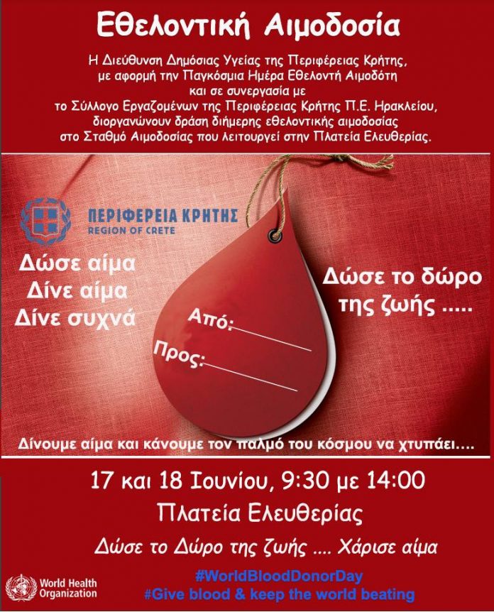 Η Διεύθυνση Δημόσιας Υγείας της Περιφέρειας Κρήτης, με αφορμή την Παγκόσμια Ημέρα Εθελοντή Αιμοδότη και σε συνεργασία με το Σύλλογο Υπαλλήλων της Περιφέρειας Κρήτης-Π.Ε. Ηρακλείου, διοργανώνουν δράση διήμερης εθελοντικής αιμοδοσίας στο Σταθμό Αιμοδοσίας που λειτουργεί στην πλ. Ελευθερίας, Πέμπτη και Παρασκευή, 17 και 18 Ιουνίου, 9:30 το πρωί με 2:00 το μεσημέρι.