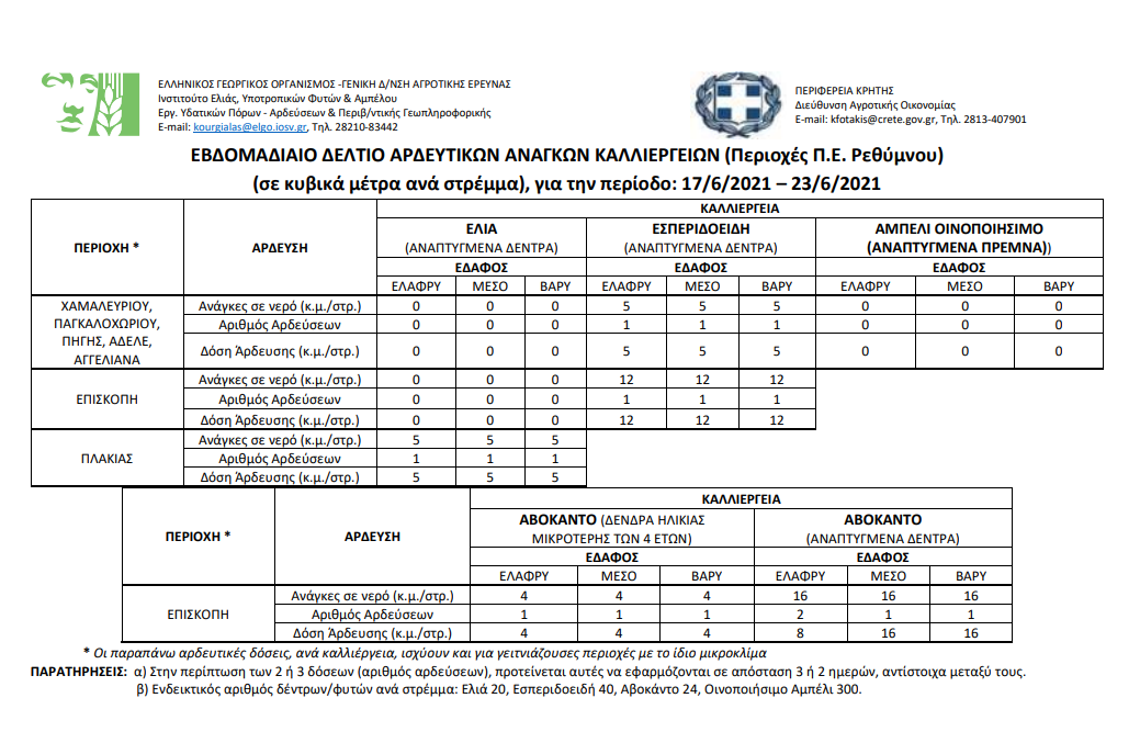 Εβδομαδιαίο δελτίο αρδευτικών αναγκών καλλιεργειών Περιφερειακής Ενότητας Ηρακλείου