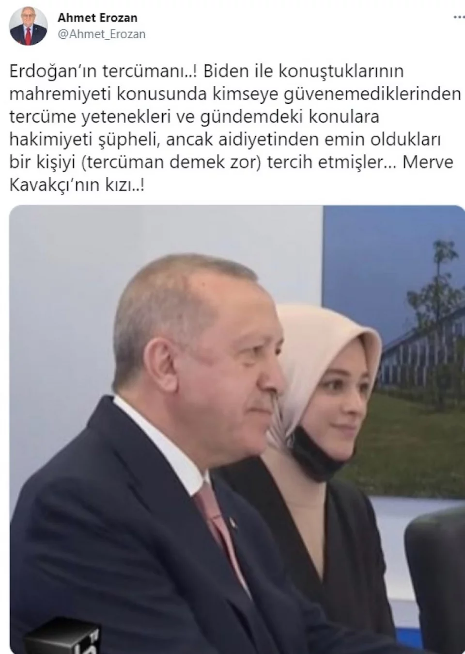Ο επικεφαλής του κόμματος İyi Parti, Ahmet Erozan, εξαπέλυσε τα πυρά του κατά της διερμηνέως του Ερντογάν, και αναφέρθηκε στο γεγονός ότι είναι κόρη της Μερβέ Σαφά Καβακτσί, μέλους του κυβερνώντος κόμματος ΑΚP.
