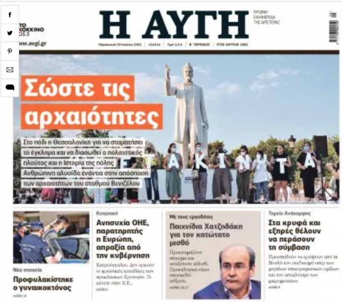 Σήμερα η αξιωματική αντιπολίτευση κορυφώνει τον αγώνα κατά της απόσπασης αρχαίων στο μετρό Θεσσαλονίκης, χωρίς αναφορά στο παρελθόν του έργου. Είναι χαρακτηριστικό ότι η Αυγή έχει εξώφυλλο το σχετικό θέμα, χωρίς να θυμίζει τι είχε συμβεί στην περίπτωση της «Αγίας Σοφίας»:
