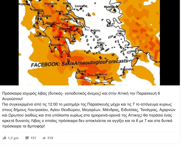 Ενδεικτική είναι η ανάρτηση του μετεωρολόγου Σάκη Αρναούτογλου στο facebook, ο οποίος γράφει για ισχυρό λίβα (δυτικό-νοτιοδυτικό άνεμο) και στην Αττική την Παρασκευή 6 Αυγούστου.