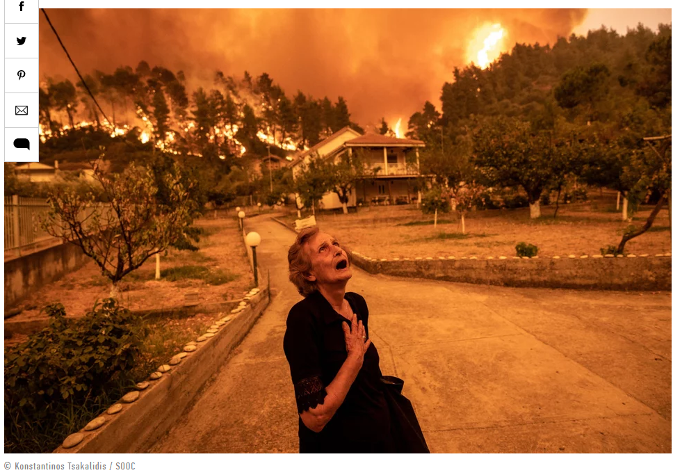 Με μια κίνηση του χεριού της, με τα μάτια κλειστά και το στόμα ανοιχτό, αποτύπωσε τον πόνο και την απόγνωση που ένιωθε, τη στιγμή που άφηνε πίσω το σπίτι της, στις Γούβες της Εύβοιας καθώς η πύρινη λαίλαπα πλησίαζε.