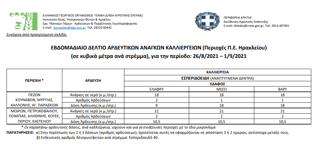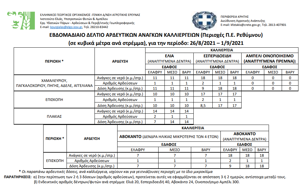 Εβδομαδιαίο δελτίο αρδευτικών αναγκών καλλιεργειών Περιφερειακής Ενότητας Ηρακλείου