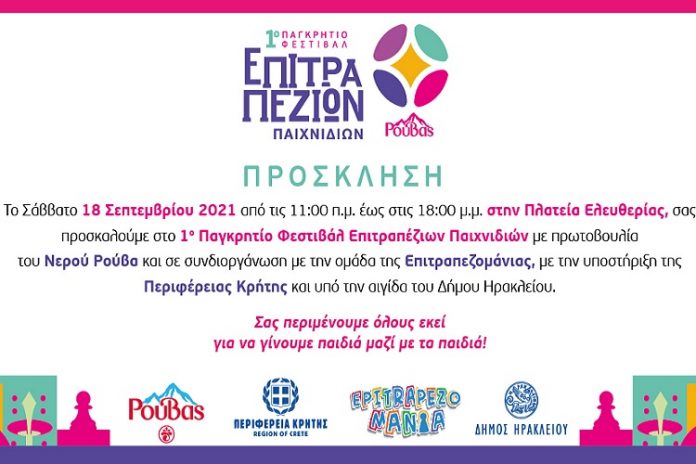 1ο ΠΑΓΚΡΗΤΙΟ ΦΕΣΤΙΒΑΛ ΕΠΙΤΡΑΠΕΖΙΩΝ ΠΑΙΧΝΙΔΙΩΝ- ΤΟ ΣΑΒΒΑΤΟ 18 ΣΕΠΤΕΜΒΡΙΟΥ 2021/11:00πμ – 18:00μ.μ.