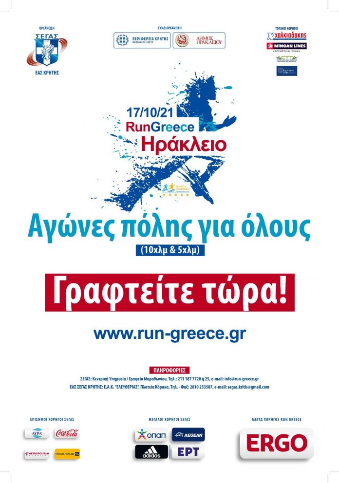 Το Run Greece Ηράκλειο, περιλαμβάνει δύο αγωνίσματα 10 και 5 χλμ.        Θα διεξαχθεί την Κυριακή 17 Οκτωβρίου με εκκίνηση και τερματισμό το Παγκρήτιο στάδιο και τον  διοργανώνουν ο Σ.Ε.Γ.Α.Σ.  και η Ε.Α.Σ. Σ.Ε.ΓΑ.Σ. Κρήτης με συνδιοργανωτές την ΠΕΡΙΦΕΡΕΙΑ ΚΡΗΤΗΣ και τον ΔΗΜΟ ΗΡΑΚΛΕΙΟΥ, μεγάλο χορηγό την ERGO Ασφαλιστική και τοπικoύς  χορηγούς  τα Super Market  Χαλκιαδάκης και τις Μινωικές Γραμμές,