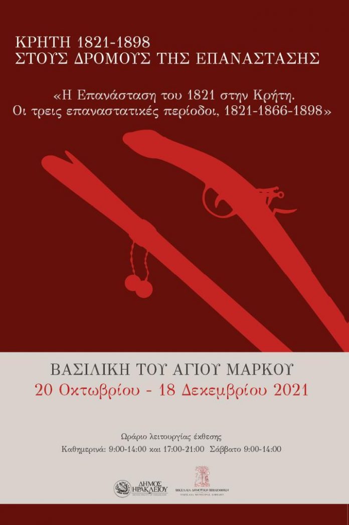 Απόψε, Τετάρτη 20 Οκτωβρίου 2021 στις 19:00 θα πραγματοποιηθούν τα εγκαίνια της Έκθεσης «Κρήτη 1821-1898: Στους δρόμους της Επανάστασης» που διοργανώνει ο Δήμος Ηρακλείου και η Βικελαία Δημοτική Βιβλιοθήκη στο πλαίσιο των εορτασμών για τα διακόσια χρόνια από την Εθνεγερσία του 1821, στη Βασιλική του Αγίου Μάρκου. Πρόκειται για μία σημαντική έκθεση με κειμήλια των Αγώνων του Κρητικού λαού κατά των Οθωμανών, ντοκουμέντα και στοιχεία. Η Έκθεση αυτή αναφέρεται σε τρεις αιματηρές επαναστάσεις που έγιναν στην Κρήτη (1821, 1866, 1897) και περιλαμβάνει αντικείμενα από τις ιδιωτικές συλλογές των Γεωργίου Μπαλαφούτη, Δημήτρη Σκαρτσιλάκη, Ευτύχη Τζιρτζιλάκη και από τις συλλογές του Εθνικού Ιστορικού Μουσείου στην Αθήνα και της Ιεράς Μονής Αρκαδίου.