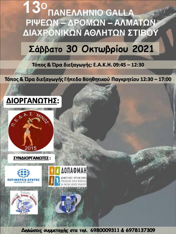 Με τη συνδιοργάνωση της Περιφέρειας Κρήτης η Παγκρήτια Ένωση Διαχρονικών Αθλητών Στίβου (ΠΕΔΑΣ) Μίνως διοργανώνει το 13ο Πανελλήνιο Gala Ρίψεων – Δρόμων – Αλμάτων Διαχρονικών Αθλητών Στίβου, το Σάββατο 30 Οκτωβρίου 2021 και ώρες 12:30 – 17:30, στο Παγκρήτιο Στάδιο.
