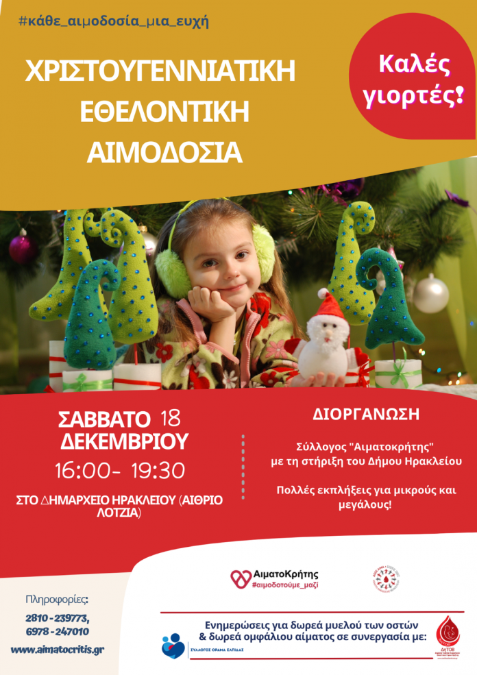 Εθελοντική Αιμοδοσία θα πραγματοποιηθεί το Σάββατο 11.12.2021 στο κέντρο της πόλης του Ηρακλείου (στο Αίθριο της Λότζια), από τις 09:00 έως τις 13:30 και το απόγευμα από τις 16:00-19:30 , με δράσεις για μαθητές και πολλές εκπλήξεις για μικρούς και μεγάλους