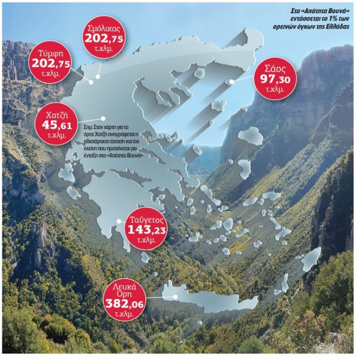 - Οι περιοχές που θα ενταχθούν στα «Απάτητα Βουνά» είναι: Λευκά Όρη, Σάος, Σμόλικας, Τύμφη, Ταΰγετος και Χατζή. Ειδικότερα στις περιοχές αυτές: