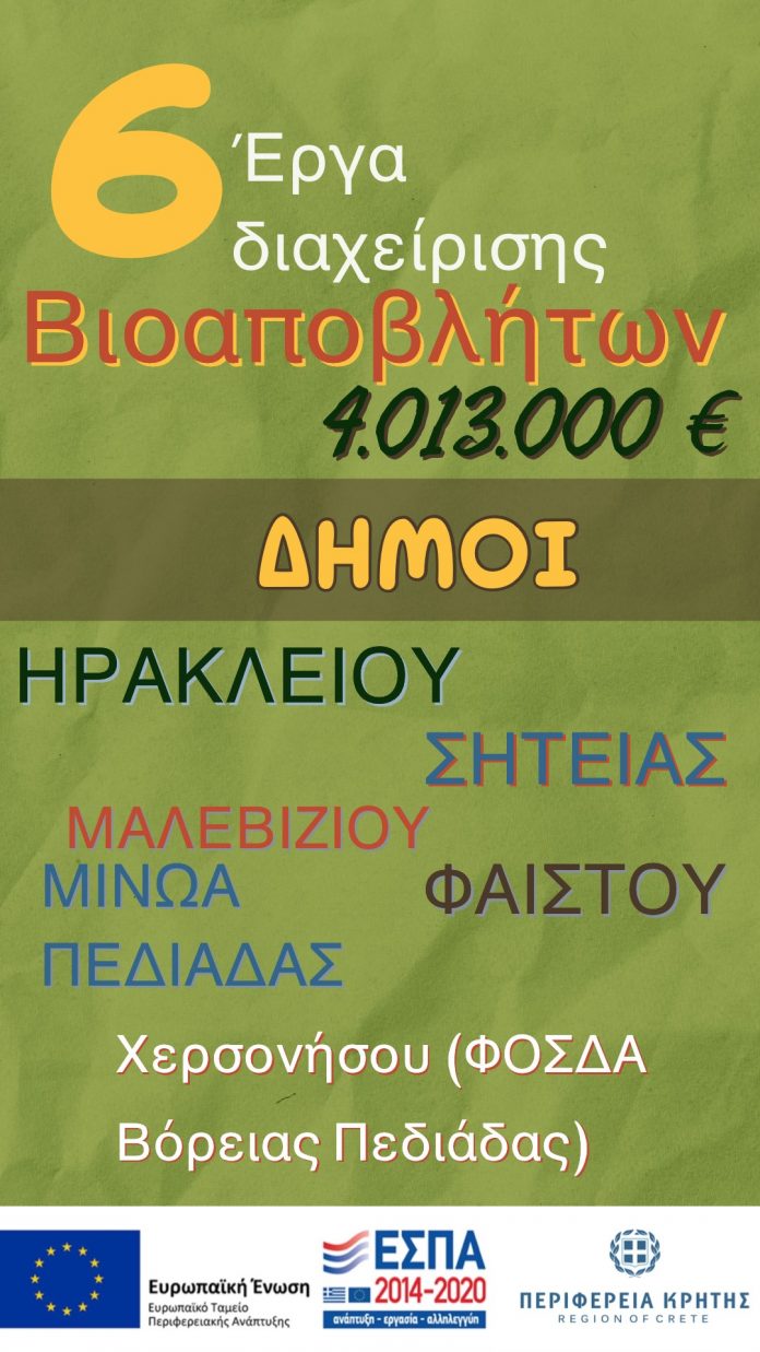 Με απόφαση του Περιφερειάρχη Κρήτης Σταύρου Αρναουτάκηεντάσσονται Έξι (6) νέα έργα διαχείρισης βιοαποβλήτων  στο Περιφερειακό Πρόγραμμα «Κρήτη 2014-2020», με συνολικό προϋπολογισμό 4.013.000 ευρώ.