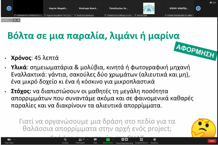 Η κα Η. Αλάμπεη παρουσίασε με διαδραστικό τρόπο το εκπαιδευτικό υλικό, που μέσα από μια σειρά δραστηριοτήτων έχει στόχο να ευαισθητοποιήσει και να παρακινήσει σε δράση τους μαθητές. Τέλος, η κα Β. Μαλωτίδη παρουσίασε τη μεθοδολογία και τον τρόπο οργάνωσης ενός καθαρισμού και παρακολούθησης μιας ακτής.