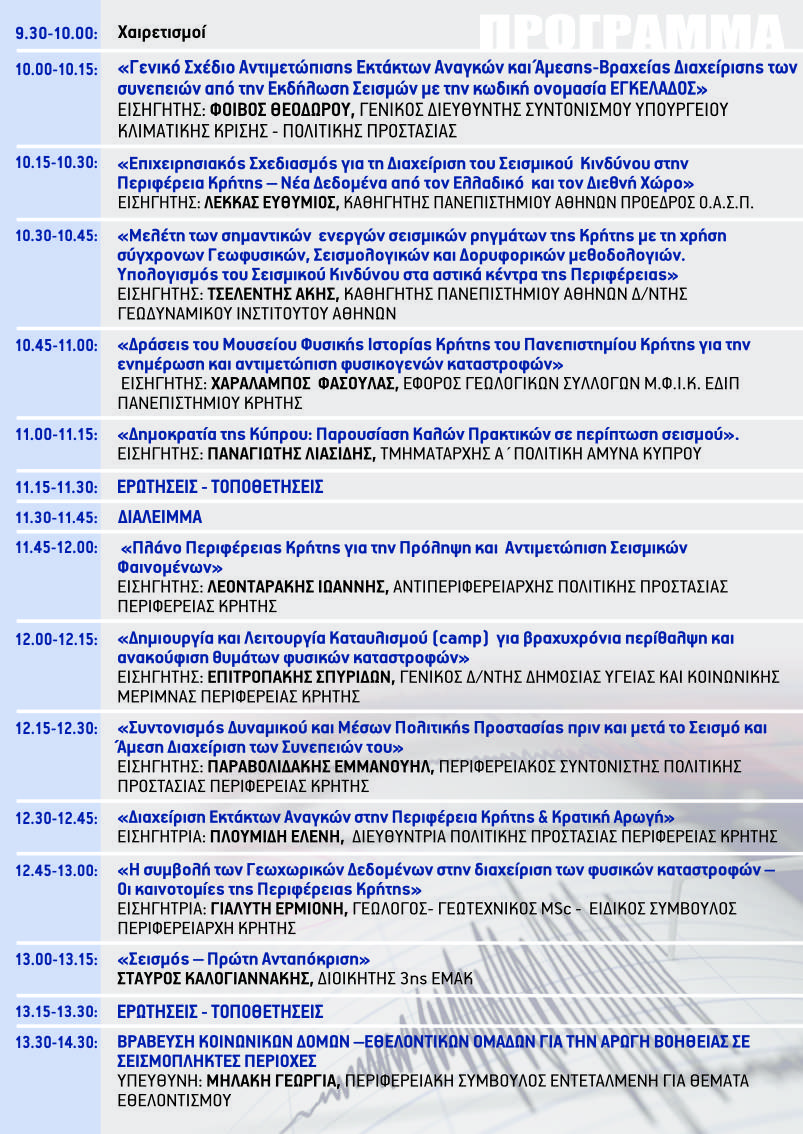 11.45-12.00: «Πλάνο Περιφέρειας Κρήτης για την Πρόληψη και Αντιμετώπιση Σεισμικών Φαινομένων»