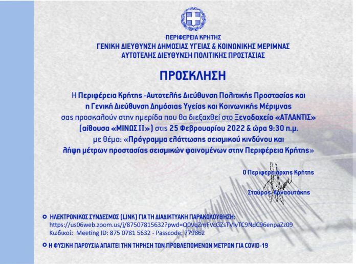 Η Γενική Διεύθυνση Δημόσιας Υγείας και Κοινωνικής Μέριμνας της Περιφέρειας Κρήτης σε συνεργασία με την Αυτοτελή Διεύθυνση Πολιτικής Προστασίας Περιφέρειας Κρήτης, πραγματοποιεί ημερίδα με θέμα: «Πρόγραμμα Ελάττωσης Σεισμικού Κινδύνου και Λήψη Μέτρων Προστασίας Σεισμικών Φαινομένων στην Περιφέρεια Κρήτης». Η ημερίδα θα πραγματοποιηθεί την Παρασκευή 25 Φεβρουαρίου 2022 από τις 9:30 π.μ. έως τις 14:30 μ.μ. στο ξενοδοχείο «Ατλαντίς» στην αίθουσα «Μίνως 2».