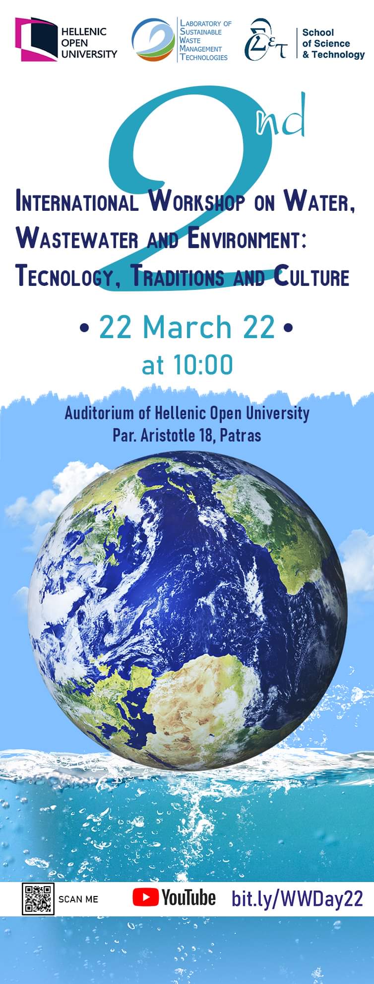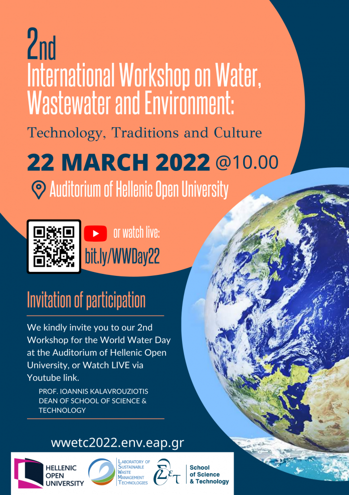 Σας γνωρίζουμε ότι θα διεξαχθεί η 2η διεθνής συνάντηση (workshop) στο Ελληνικό Ανοικτό Πανεπιστήμιο (Αμφιθέατρο Κτιρίου Δ) στην Πάτρα στα πλαίσια του εορτασμού της Παγκόσμιας Ημέρας για το Νερό, όπου και θα επιδιωχθεί αναζήτηση αποτελεσματικών τρόπων συνεργασίας των επιστημονικών Διεθνών και Εθνικών Οργανώσεων που ασχολούνται με την ιστορία του νερού και των υγρών αποβλήτων.Η συνάντηση θα πραγματοποιηθεί στις 22 Mαρτίου 2022 (Παγκόσμια Ημέρα Νερού), με θέμα «Water, Wastewater and Environment: Technology, Traditions and Culture».