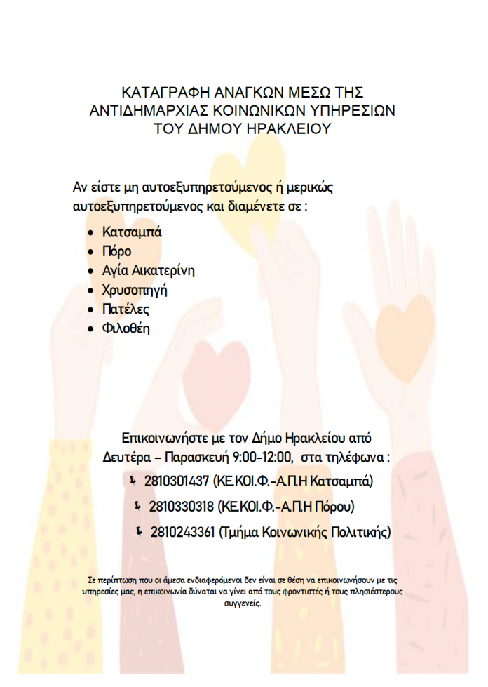 Πιο συγκεκριμένα η έρευνα θα διεξαχθεί στις περιοχές: Κατσαμπάς, Πόρος, Αγία Αικατερίνη, Χρυσοπηγή, Πατέλες και Φιλοθέη, και αφορά σε πολίτες που έχουν ανάγκη υποστήριξης στην καθημερινότητα τους και είναι μερικώς ή μη αυτοεξυπηρετούμενοι. Για το λόγο αυτό καλούνται οι κάτοικοι των παραπάνω περιοχών που επιθυμούν να συμμετέχουν να επικοινωνήσουν με τα τηλέφωνα: 2810 301437 (ΚΕ.ΚΟΙ.Φ.-Α.Π.Η Κατσαμπά, Χριστίνα Κατσίβα), 2810 330318 (ΚΕ.ΚΟΙ.Φ.-Α.Π.Η Πόρου, Μανόλης Βασιλοκωνσταντάκης) και 2810 243361 (Τμήμα Κοινωνικής Πολιτικής, Κατερίνα Μόσχου) , από Δευτέρα έως Παρασκευή 9:00π.μ- 12:00μ.μ..
