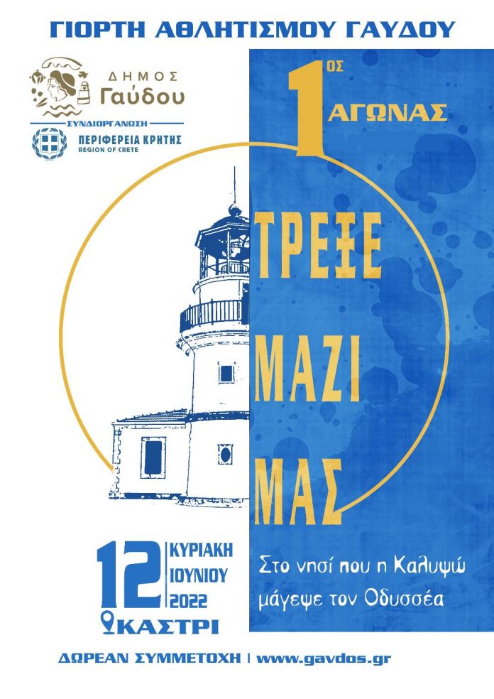 Στο νοτιότερο άκρο της Ευρώπης, στο νησί της Καλυψώς, στην ακριτική Γαύδο, ο Δήμος Γαύδου, με συνδιοργανωτή την Περιφέρεια Κρήτης στο πλαίσιο της Γιορτής Αθλητισμού προκηρύσσουν τους: «1ους Αγώνες Γαύδου».