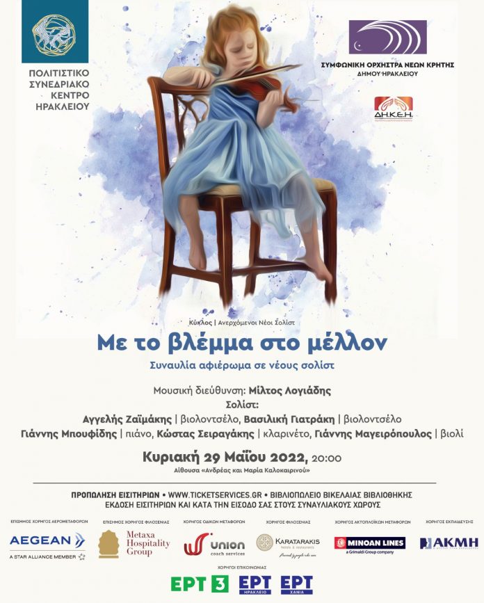 Η Συμφωνική Ορχήστρα Νέων Κρήτης του Δήμου Ηρακλείου – Σ.Ο.Ν.Κ.Δ.Η. με χαρά και περηφάνια συνδιαλέγεται με νέους και πολλά υποσχόμενους σολίστες του τόπου μας. Μαζί παρουσιάζουν ένα πρόγραμμα έργων από το μπαρόκ μέχρι τον Ρομαντισμό για σόλο όργανα και ορχήστρα.