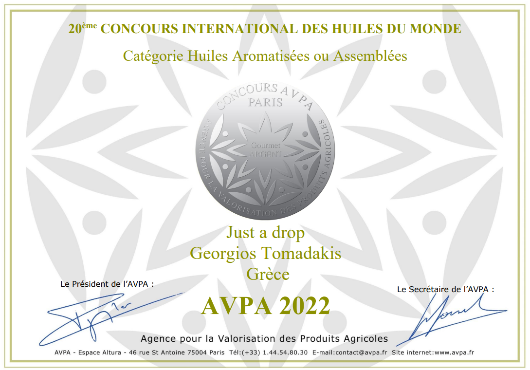 Τα βραβεία απονεμήθηκαν σε δύο προϊόντα της σειράς γαστρονομικών ελαιολάδων «Just a Drop” που παράγονται με πρότυπη μέθοδο φυσικής εκχύλισης αρωματικών λαδιών σε έξτρα παρθένο ελαιόλαδο. Έλαβαν ένα ΑΡΓΥΡΟ (ελαιόλαδο με τριαντάφυλλο) και ένα ΧΑΛΚΙΝΟ (ελαιόλαδο με βασιλικό) μετάλλιο για το 2022 στον σημαντικό διεθνή διαγωνισμό της AVPA (Agence pour la Valorisation des Produits Agricoles) στο Παρίσι.