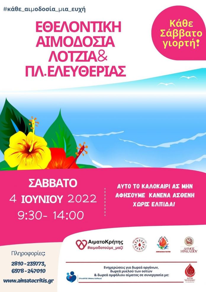Διπλή εθελοντική αιμοδοσία θα πραγματοποιηθεί το Σάββατο 04/06/2022 στο κέντρο της πόλης του Ηρακλείου και συγκεκριμένα στο αίθριο της Λότζια και στην πλατεία Ελευθερίας ,  από τις 09:30 έως τις 14:00.