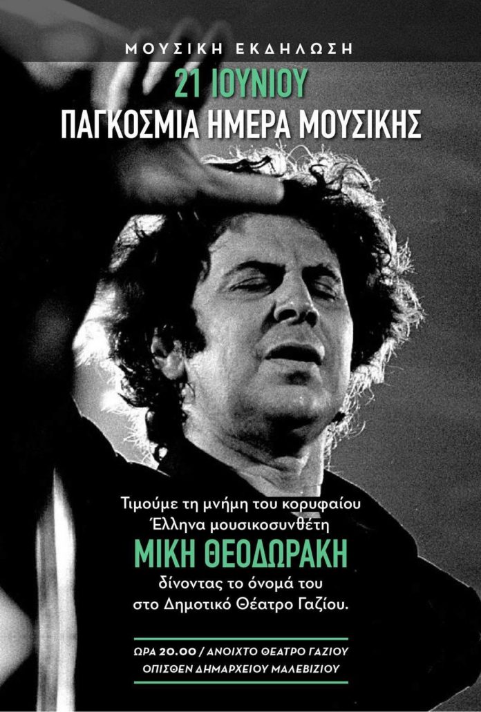 Τιμώντας τη μνήμη του κορυφαίου Έλληνα μουσικοσυνθέτη ο Δήμος Μαλεβιζίου θα δώσει το όνομά του στο Δημοτικό Θέατρο Γαζίου στο πλαίσιο μουσικής εκδήλωσης που θα πραγματοποιηθεί απόψε με αφορμή την Παγκόσμια Ημέρα Μουσικής.