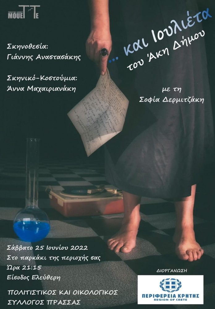 Η MoueTTe Theatre Group παρουσιάζει τον μονόλογο του Άκη Δήμου «…και Ιουλιέτα», στην Πρασσά, σε σκηνοθεσία Γιάννη Αναστασάκη και Σκηνικό – Κοστούμια Άννας Μαχαιριανάκη. Ερμηνεύει η Σοφία Δερμιτζάκη. Η παράσταση είναι Διοργάνωση της Περιφέρειας Κρήτης.
