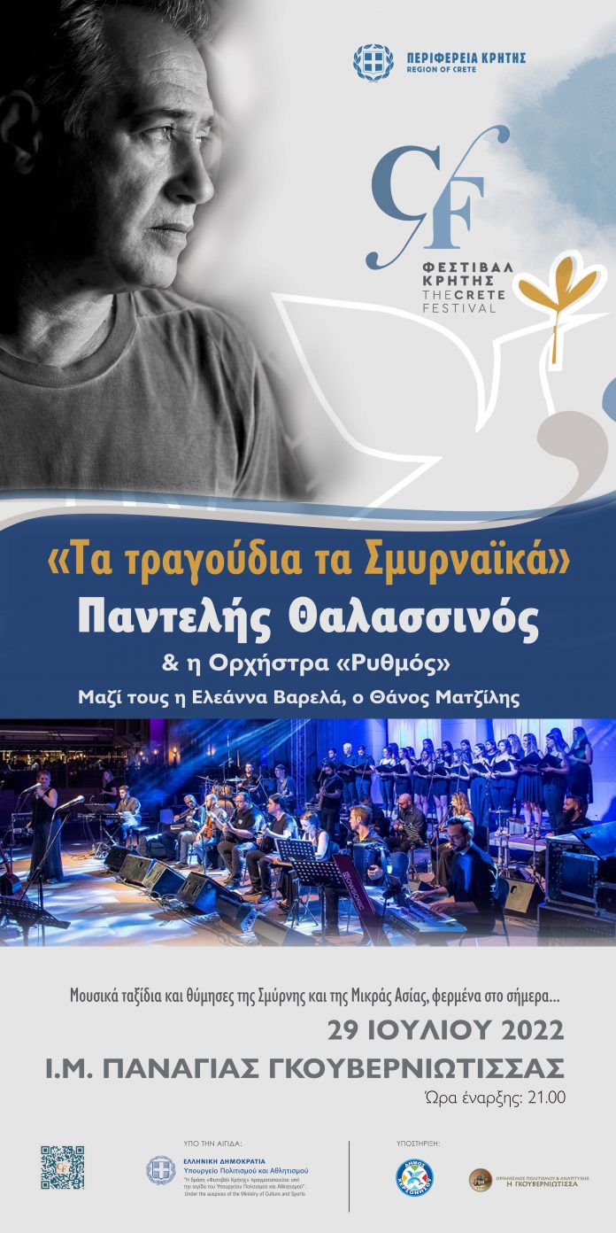 «Τα τραγούδια τα Σμυρναίικα», είναι ο τίτλος της συναυλίας με τον δημοφιλή ερμηνευτή και συνθέτη Παντελή Θαλασσινό που θα πραγματοποιηθεί στα πλαίσια του Φεστιβάλ Κρήτης με διοργανωτή την Περιφέρεια Κρήτης και με ελεύθερη είσοδο στους πολίτες, την Παρασκευή 29 Ιουλίου στις 9:30 μμ στη Ιερά Μονή της Παναγίας Γκουβερνιώτισσας, στις Ποταμιές Πεδιάδος του Δήμου Χερσονήσου.