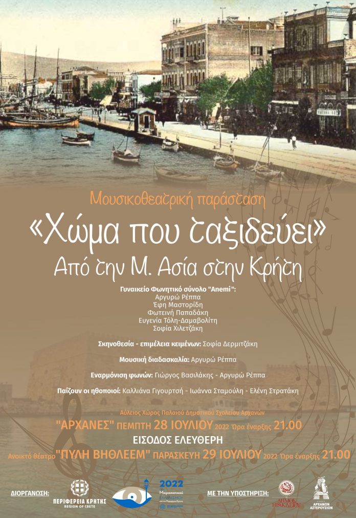 Η μουσικοθεατρική παράσταση με τίτλο: «Χώμα που ταξιδεύει…» από την Μ. Ασία στην Κρήτη, δημιουργήθηκε με αφορμή την επέτειο των 100 χρόνων από την Μικρασιατική Καταστροφή. Θα παρουσιαστεί, με την στήριξη της Περιφέρειας Κρήτης, την Πέμπτη 28 Ιουλίου 2022 στις 09.00 μ.μ. στις Αρχάνες (Αύλειος χώρος Παλαιού Δημοτικού Σχολείου Αρχανών) και την Παρασκευή 29 Ιουλίου 2022 στις 09.00 μ.μ. στο κηποθέατρο της Πύλης Βηθλεέμ στο Ηράκλειο.