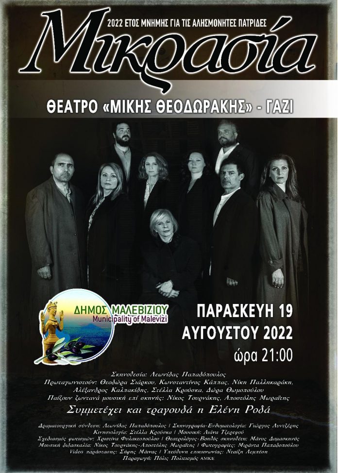 Αφιερωμένη στην Μικρασιατική καταστροφή είναι η μουσικοθεατρική παράσταση που θα έχουν την ευκαιρία να παρακολουθήσουν εντελώς δωρεάν όσοι βρεθούν στο Θέατρο Μίκης Θεοδωράκης στο Γάζι, σήμερα Παρασκευή 19 Αυγούστου στις 21.00, στο πλαίσιο των Πολιτιστικών Εκδηλώσεων του Δήμου Μαλεβιζίου.