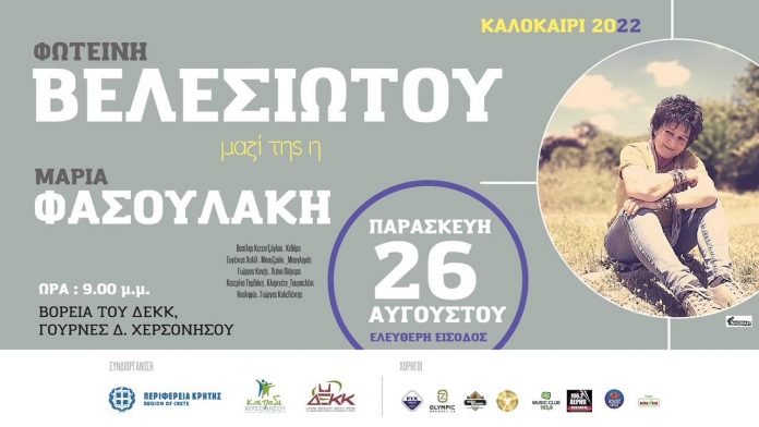 Η Περιφέρεια Κρήτης, σε συνεργασία με το ΚΟΙΠΟΔΙ και το ΔΕΚΚ, διοργανώνουν την απόψε, Παρασκευή 26 Αυγούστου συναυλία με την Φωτεινή Βελεσιώτου, στις Γούρνες Δήμου Χερσονήσου (Βόρεια του ΔΕΚΚ). Μαζί της η Μαρία Φασουλάκη.