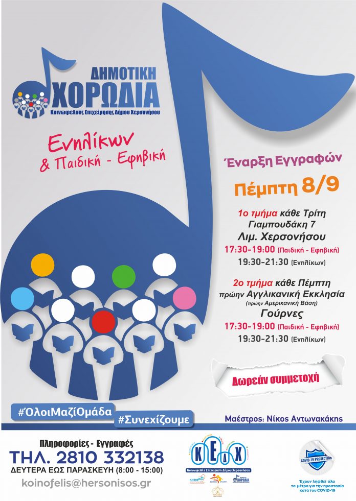Η Κοινωφελής Επιχείρηση Δήμου Χερσονήσου (Κ.Ε.Δ.Χ.) ανακοινώνει την έναρξη των εγγραφών και το πρόγραμμα προβών-μαθημάτων της Δημοτικής Χορωδίας, η οποία αποτελείται από δύο (2) τμήματα: τη Χορωδία Ενηλίκων και την Παιδική-Εφηβική Χορωδία, για την περίοδο 2022-2023.