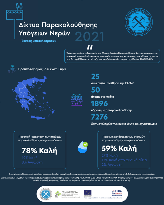 Η Ελληνική Αρχή Γεωλογικών και Μεταλλευτικών Ερευνών (ΕΑΓΜΕ) στο πλαίσιο του Έργου «Δίκτυο Παρακολούθησης Υπόγειων Νερών» (ΔΙΠΥΝ) παρέδωσε την Έκθεση Αποτελεσμάτων για το έτος 2021 στη Δ/νση Προστασίας & Διαχείρισης Υδάτινου Περιβάλλοντος του Υπουργείο Περιβάλλοντος και Ενέργειας (ΥΠΕΝ).