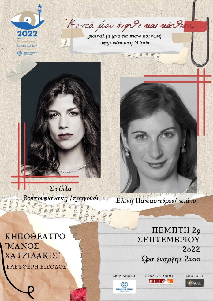 Η Περιφέρεια Κρήτης σε συνεργασία με το Δήμο Ηρακλείου, με αφορμή το έτος μνήμης για τα 100 χρόνια από την Μικρασιατική καταστροφή (1922-2022) διοργανώνουν στο ΚΗΠΟΘΕΑΤΡΟ «Μ.ΧΑΤΖΙΔΑΚΙΣ» σήμερα ΠΕΜΠΤΗ 29 ΣΕΠΤΕΜΒΡΙΟΥ 2022 το ρεσιτάλ