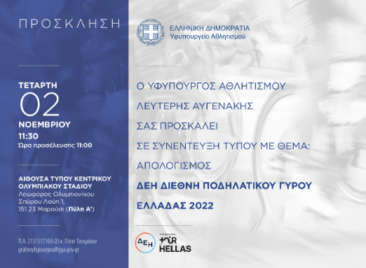 O ΔΕΗ Ποδηλατικός Γύρος Ελλάδας 2022 «αποκαλύπτεται» την Τετάρτη στις 2 Νοεμβρίου 2022, σε συνέντευξη Τύπου στην κεντρική αίθουσα του ΟΑΚΑ (11.30π.μ).