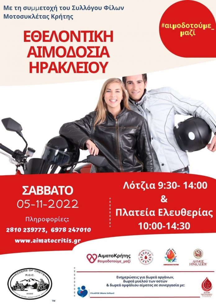 Διπλή εθελοντική αιμοδοσία θα πραγματοποιηθεί το Σάββατο 05/11/2022 στο κέντρο της πόλης του Ηρακλείου και συγκεκριμένα στο αίθριο της Λότζια απο τις 9:30 έως τις 14:00 και στην πλατεία Ελευθερίας από τις 10:00 έως τις 14:30.