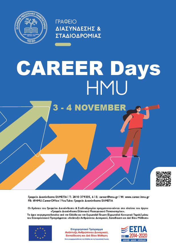 Το Γραφείο Διασύνδεσης και Σταδιοδρομίας του Ελληνικού Μεσογειακού Πανεπιστημίου με ιδιαίτερη χαρά ανακοινώνει την έναρξη του 2ημέρου εκδηλώσεων Ημέρες Καριέρας ΕΛΜΕΠΑ (Career Days HMU) 3 – 4 Νοεμβρίου 2022 (10.30 – 18.00).