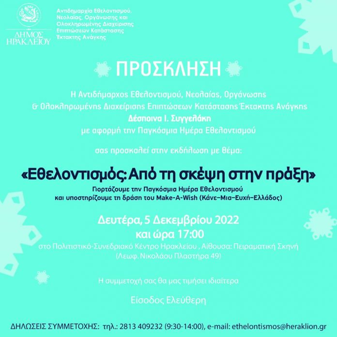 Ο Δήμος Ηρακλείου,δια της Αντιδημαρχίας Εθελοντισμού, Νεολαίας , Οργάνωσης και Ολοκληρωμένης Διαχείρισης Επιπτώσεων Κατάστασης Έκτακτης Ανάγκης , διοργανώνει εκδήλωση με θέμα: “Εθελοντισμός: Από την σκέψη στην πράξη”.