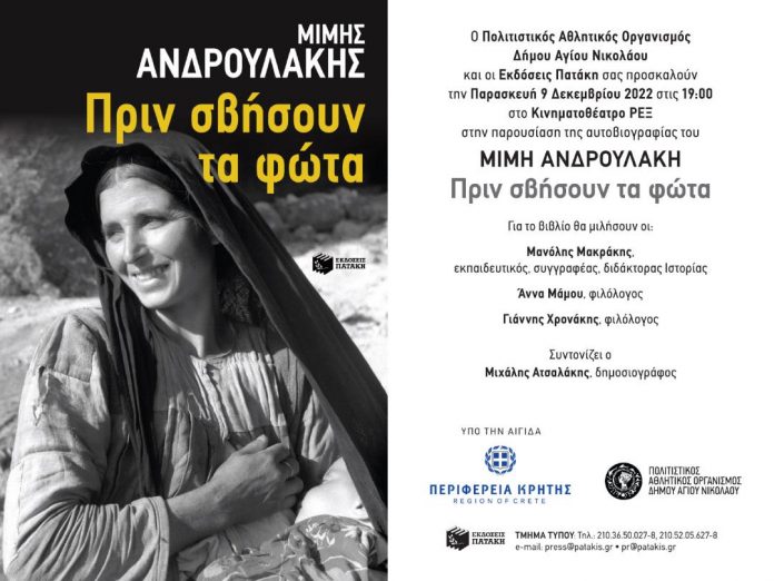 Ο Πολιτιστικός Οργανισμός Δήμου Αγίου Νικολάου και οι Εκδόσεις Πατάκη διοργανώνουν υπό την αιγίδα της Περιφέρειας Κρήτης, την παρουσίαση της αυτοβιογραφίας του Μίμη Ανδρουλάκη με το βιβλίο «Πριν σβήσουν τα φώτα».